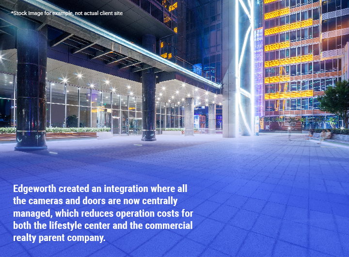 The client’s lifestyle center required a security integration that could meld the needs of all three types of spaces: retail, residential, and office. The parent realty company built the infrastructure—a large centrally managed campus—from the ground up. Previously, Edgeworth had helped migrate and refresh access control systems for the parent company when these systems were approaching end-of-life/end-of-support, so the client already knew and trusted the superior quality of work provided by Edgeworth.