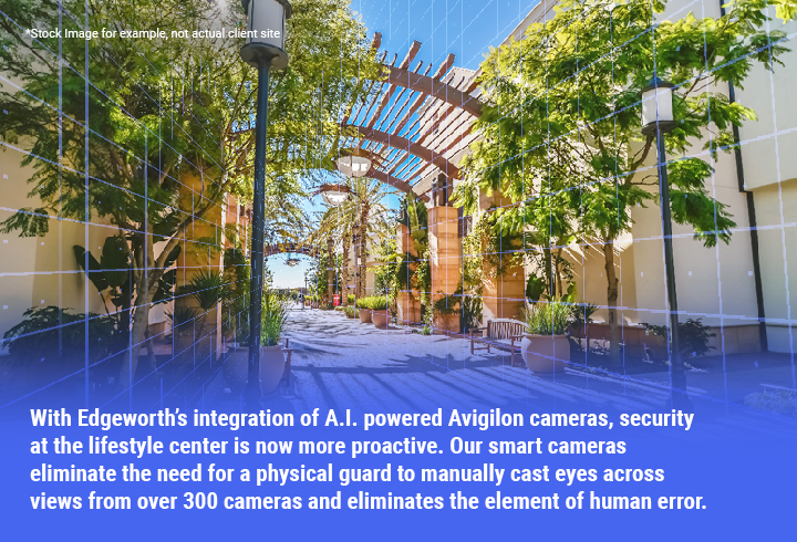 The challenge with traditional security is that it’s reactive, but with Edgeworth’s integration of A.I. powered Avigilon cameras, security at the lifestyle center is now more proactive. Edgeworth configured the system to better meet the property’s needs and maximize the impact these A.I.-powered, smart cameras have in guarding against and alerting to unwanted activity. During the configuration, Edgeworth’s integration team delineated the parameters on the smart cameras’ views and established what activity the cameras were to send alerts for. For example, if the smart cameras notice a car driving around the site at an unusual time, a person entering an unauthorized area, or an object crossing a perimeter but not leaving it, the camera’s Artificial Intelligence will send an alert to the property’s monitoring center in real time. The expertise in configuration ensures fewer false alerts, alleviating time spent reviewing non-event alerts. These smart cameras eliminate the need for a physical guard to manually cast eyes across views from over 300 cameras and eliminates the element of human error. This provides greater efficiency in the use of manned guard resources and reduces cost while improving outcomes. This has also led to a decrease in time to discovery and time to response, mitigating the risk to people and property from any events that might occur.
