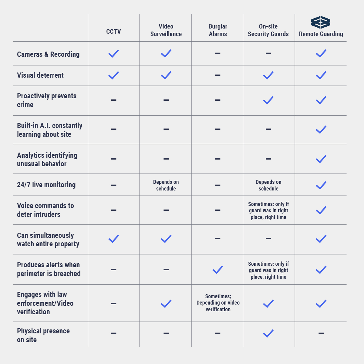 So how does Remote Guarding stack up against CCTV, video surveillance, burglar alarms and on-site security guards? When comparing strengths and features, Remote Guarding provides the most comprehensive and robust range of security coverage.