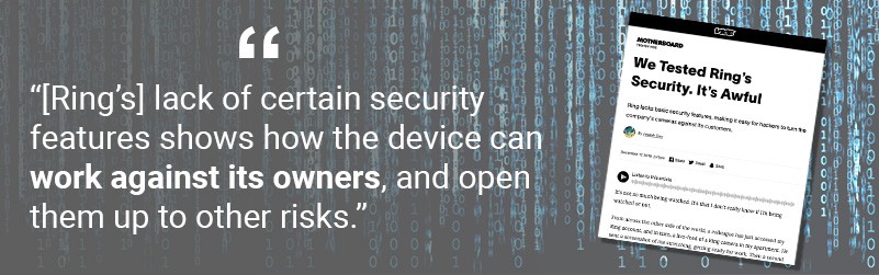 As recently as 2019, ongoing hacker attacks compromised over 55,000 Ring accounts, allowing the criminals access to the victims’ personal data, historical video files, and direct access to their cameras. Hackers were connecting with camera speakers, harassing the occupants, and then uploading or live streaming the resulting videos. Besides outside criminals gaining illegal access to Ring accounts, the sheer scale and entry level application of Ring leaves consumers extremely vulnerable to privacy intrusions from unvetted and untrustworthy Ring employees.