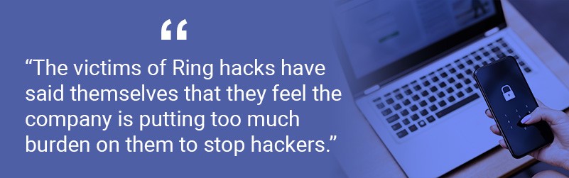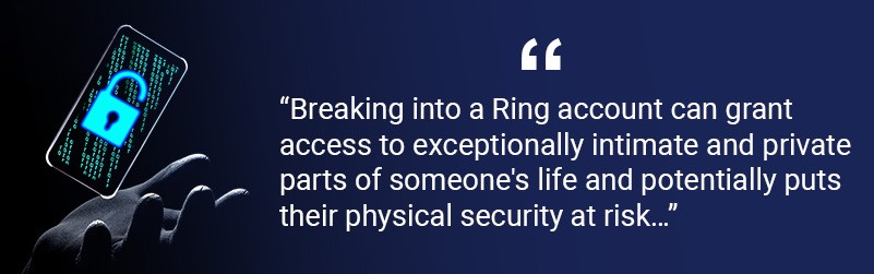 Valuables don’t just start and stop with money and property. Data is another valuable at risk. In the publicized hacks of Ring devices and accounts, perpetrators were able to gain access to the victim’s Personal Identification Information (PII). Information like names, date of birth, address, and other data were captured, as well as bank account information. If customers reuse passwords, the capture of Ring account passwords add a web of additional risked accounts. All of this captures data allows criminals everything they need to steal the victim’s identities.