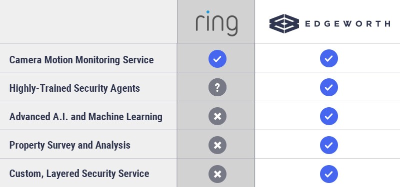So how does Ring compare a high-end remote monitoring system like Edgeworth Security’s Remote Guarding? The major points of difference are: Privacy protection, Price, Capabilities and Execution, and the Full-service family of solutions for layers of protection.